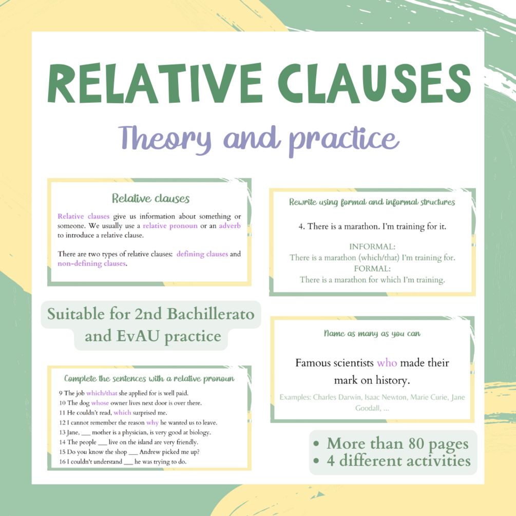 With more than 80 pages, this teaching material provides both theoretical guidelines on relative clauses and four different activities for your students to practice and ace this grammar content.