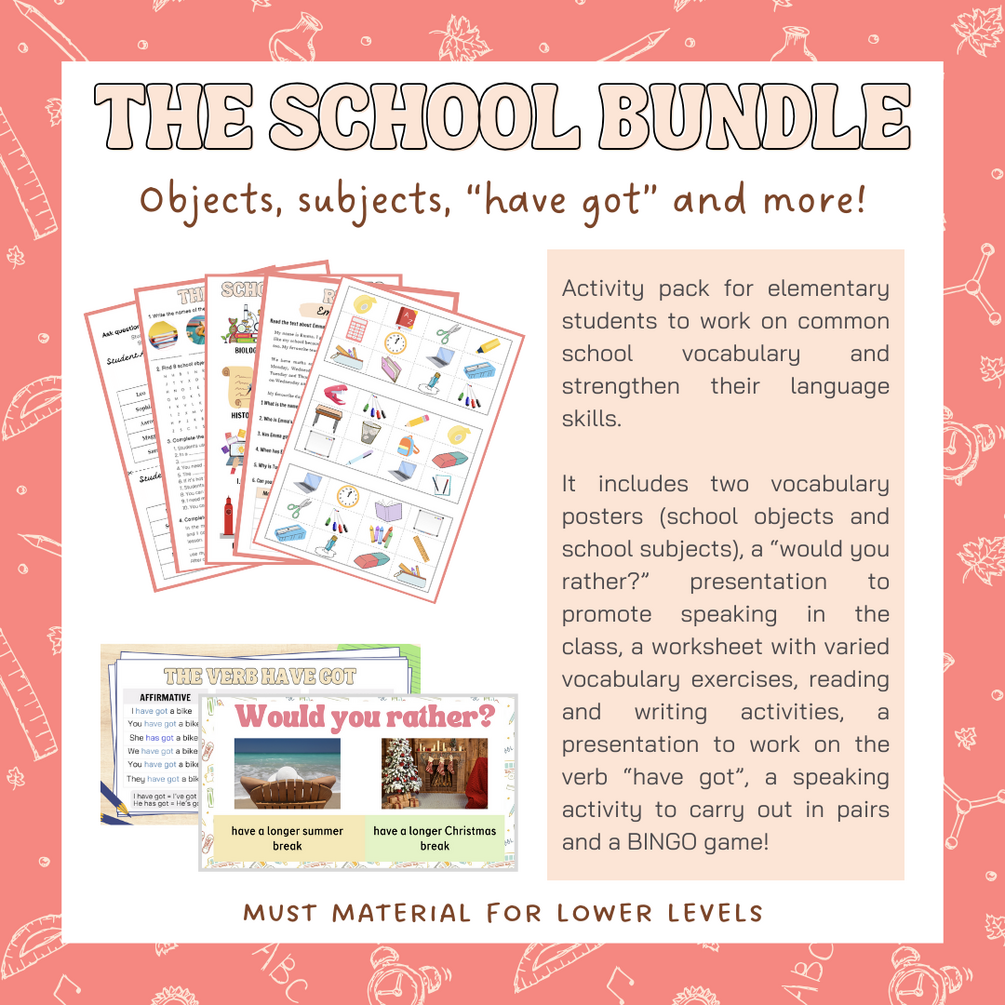 This teaching resource includes different materials and activities (a total of 75 pages!) to work on common school vocabulary, grammar and strengthen the students' language skills.